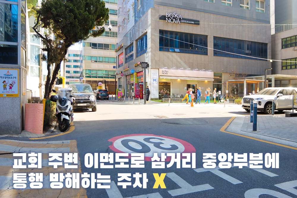 3. 교회 주변 이면도로 삼거리 중앙부분에 통행 방해하는 주차