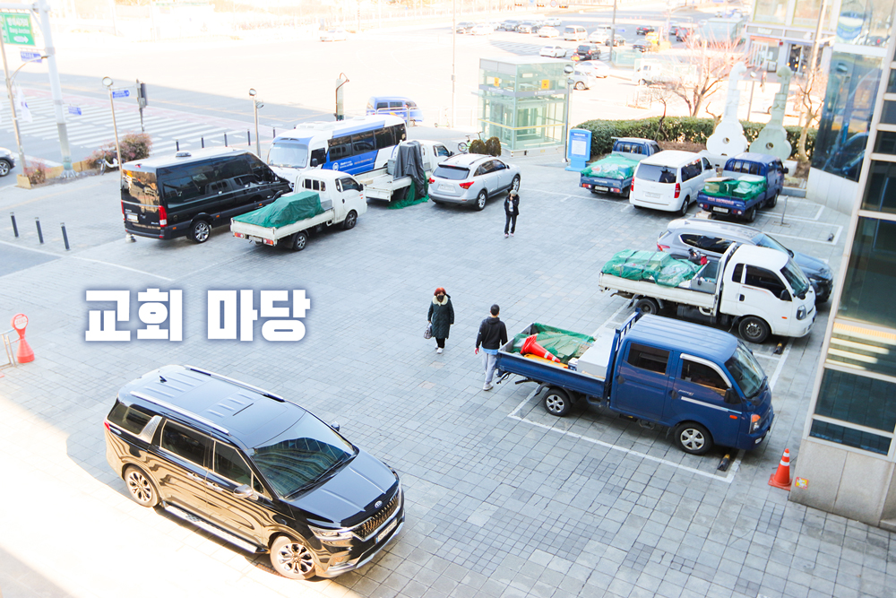1. 교회 마당 : 40대 (주차선 : 10대 / 통로 : 30대)